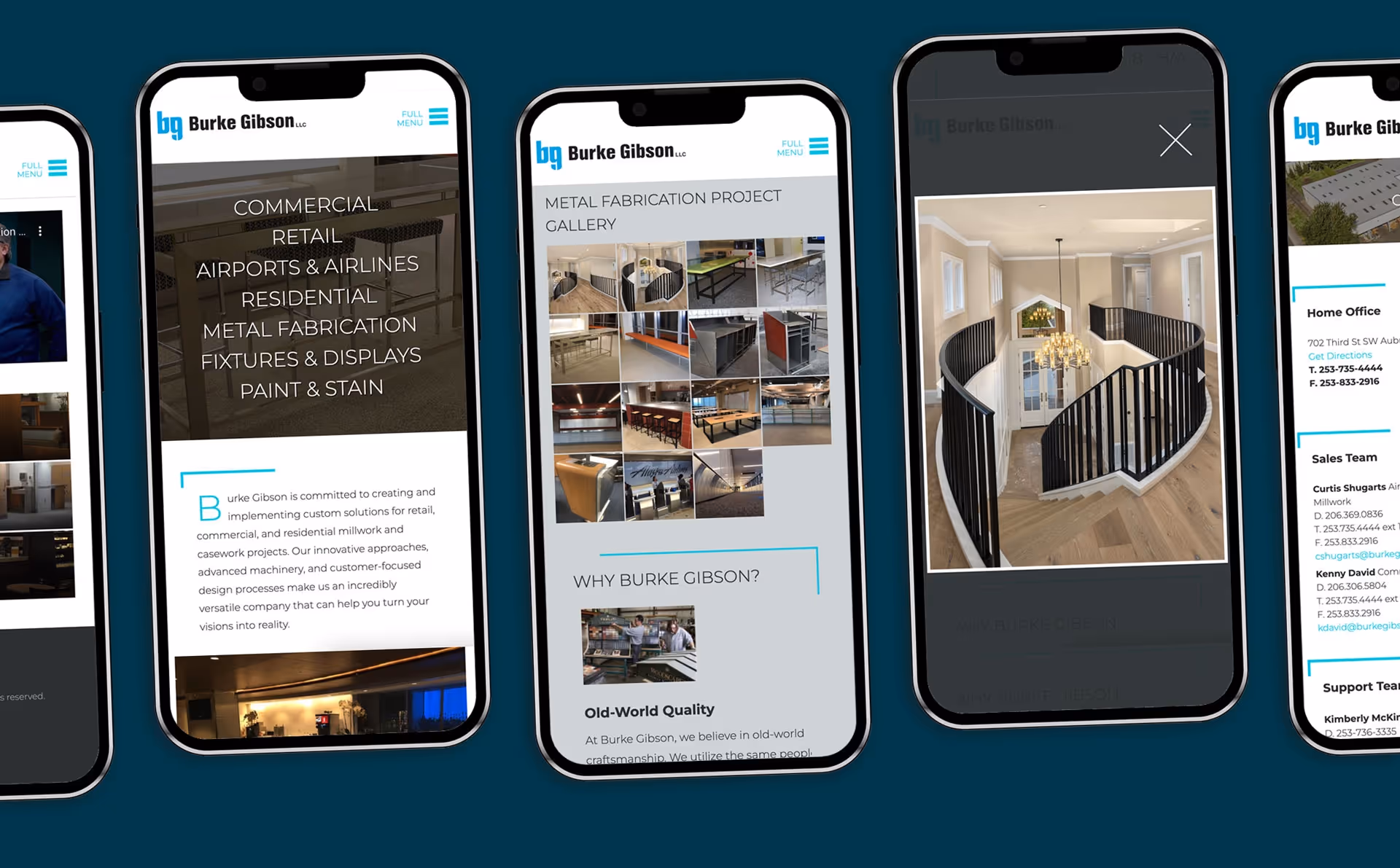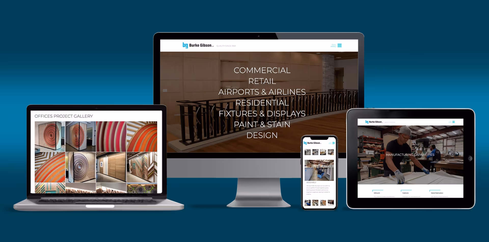 We worked closely with Burke Gibson’s team to modernize the brand, color scheme, and messaging to appeal to a broader audience beyond paint and stain displays. We also built a marketing campaign to leverage their capabilities and draw in more project opportunities, from residential and commercial millwork to airport fixtures and furnishings.