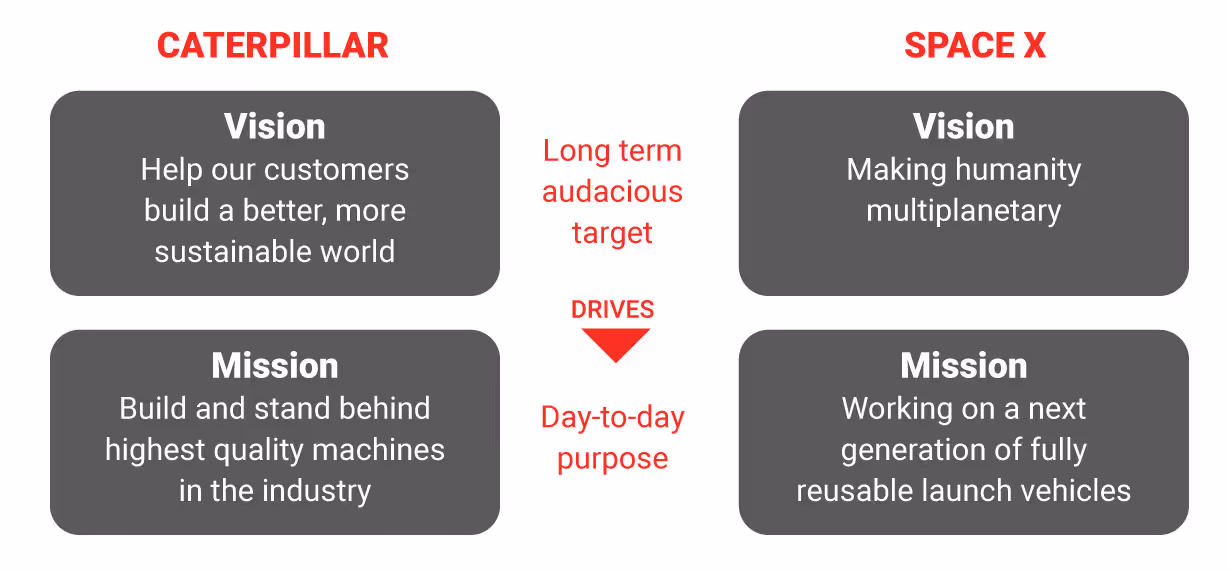 For instance, Caterpillar’s mission is to design, manufacture and sell advanced construction equipment. Its vision however is to contribute to a world in which all people’s basic needs – such as shelter, clean water, sanitation, food, and reliable power – are fulfilled in an environmentally sustainable way.